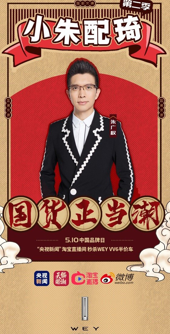 5月10日晚8点,央视新闻联合天猫国潮为中国品牌日专门定制的“国货正当潮”专场火热来袭,“小朱配琦”经典组合再度出山,倾情直播带货当潮国货。其中,中国豪华SUV WEY品牌旗下VV6,作为本场直播中唯一的汽车品类代表,更由央视名嘴朱广权首次体验后亲自力荐。伴随有感而发的金句奔涌,全场直播最高在线人数高达4013.7万次、获赞2564万次,期间天猫长城旗舰店访客量暴增59万人次,实现了高效引流转化。WEY VV6 整车订金订单 7473笔,高达44036人参与抢购限时秒杀的VV6半价车,10点整秒售罄,预计销售金额近12亿元,创下线上营销新纪录。WEY品牌首次尝试直播带货即成为刷屏事件。
